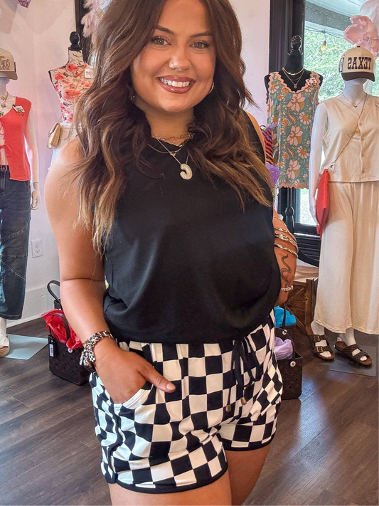 Black Checkered Drawstring Elastic Waist Casual Shorts