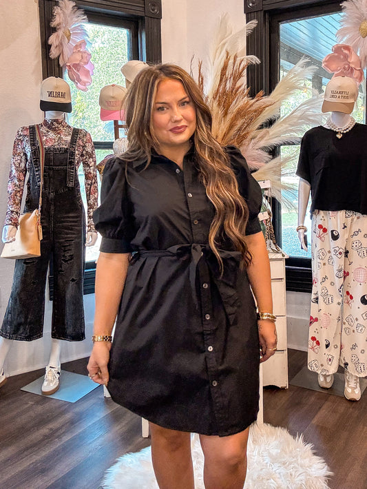 Black Button Up Tie Waist Puff Sleeve Mini Dress