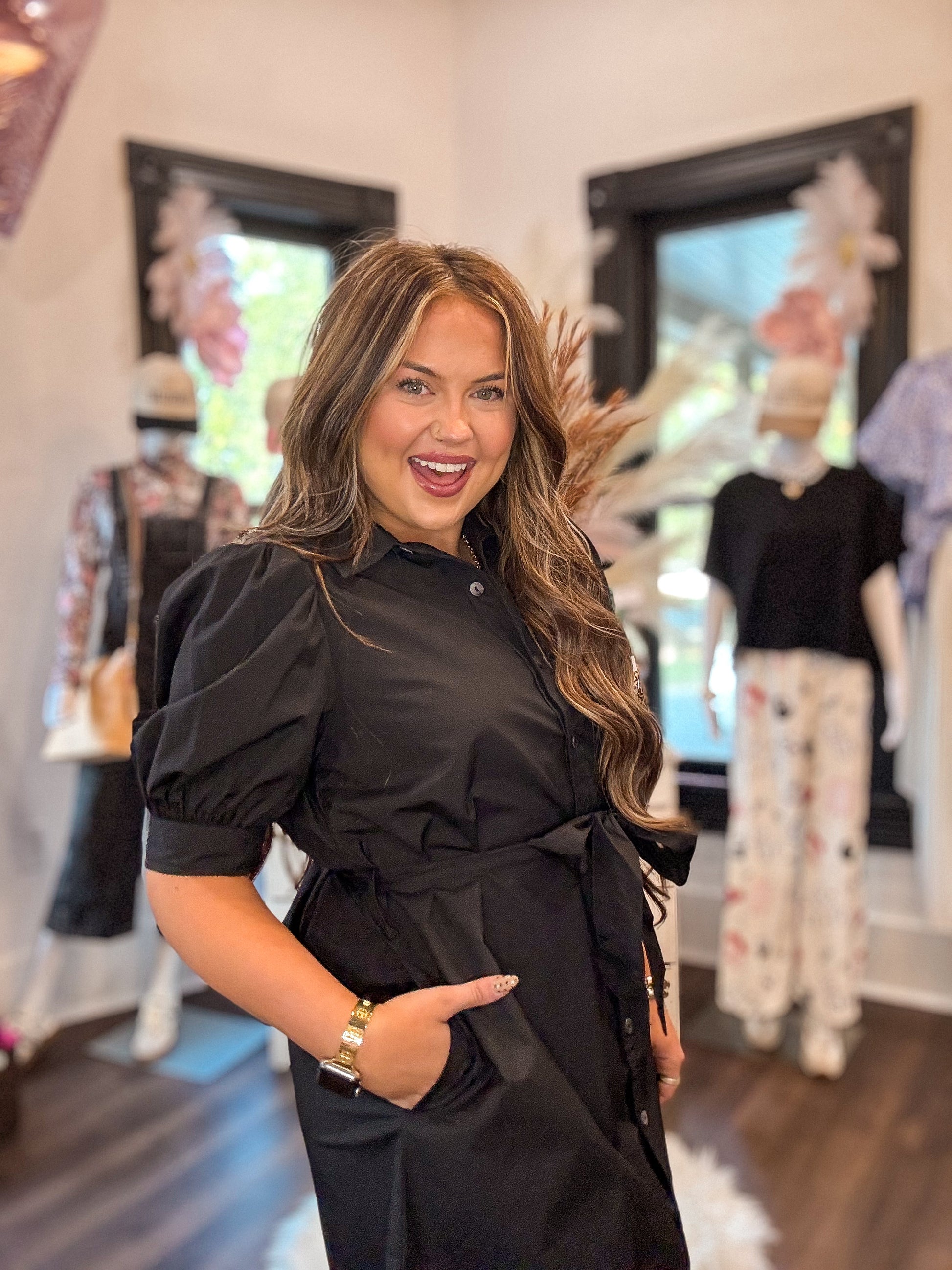 This Black Button Up Tie Waist Mini Dress features elegant puff sleeves and a flattering tie waist that enhances your silhouette. Its classic button-up design offers versatility for both casual outings and dressier occasions. Comfortable and stylish, this dress is perfect for adding a chic touch to your wardrobe while providing ease of movement throughout your day.