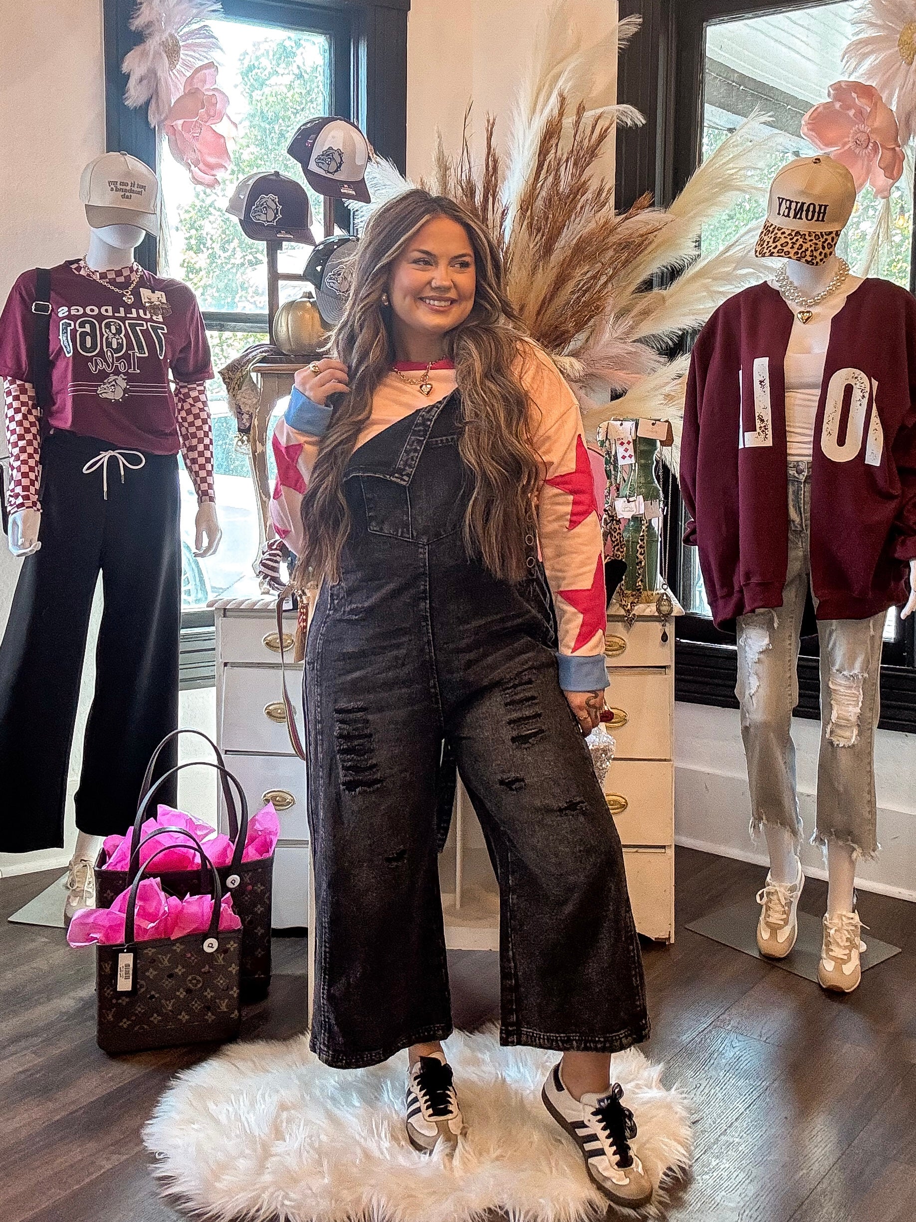Embrace comfort and style with these Black Distressed Bib Pocket Wide Leg Denim Overalls. The relaxed wide-leg design offers ease of movement, while the distressed details add a trendy, lived-in look. Featuring a classic bib pocket and durable denim fabric, these overalls are perfect for everyday wear, providing both functionality and a laid-back vibe you'll love.