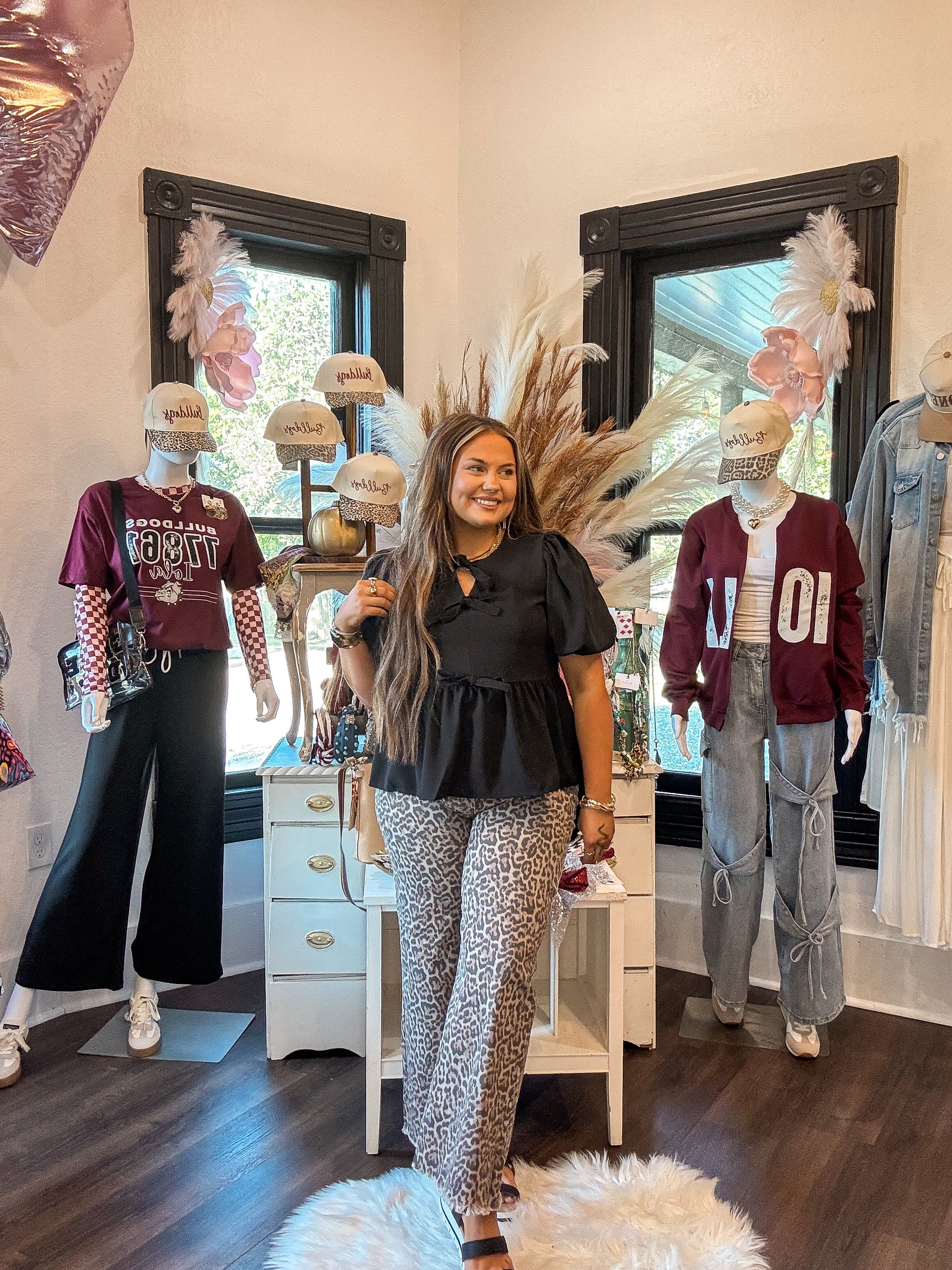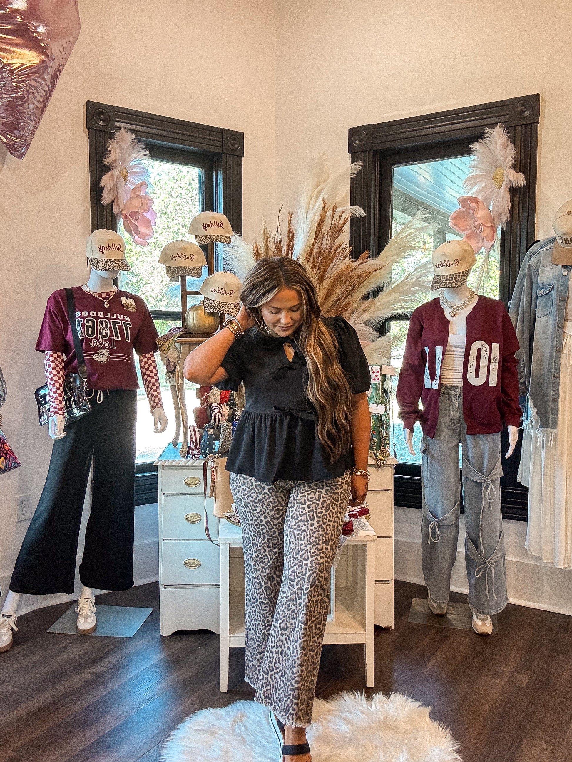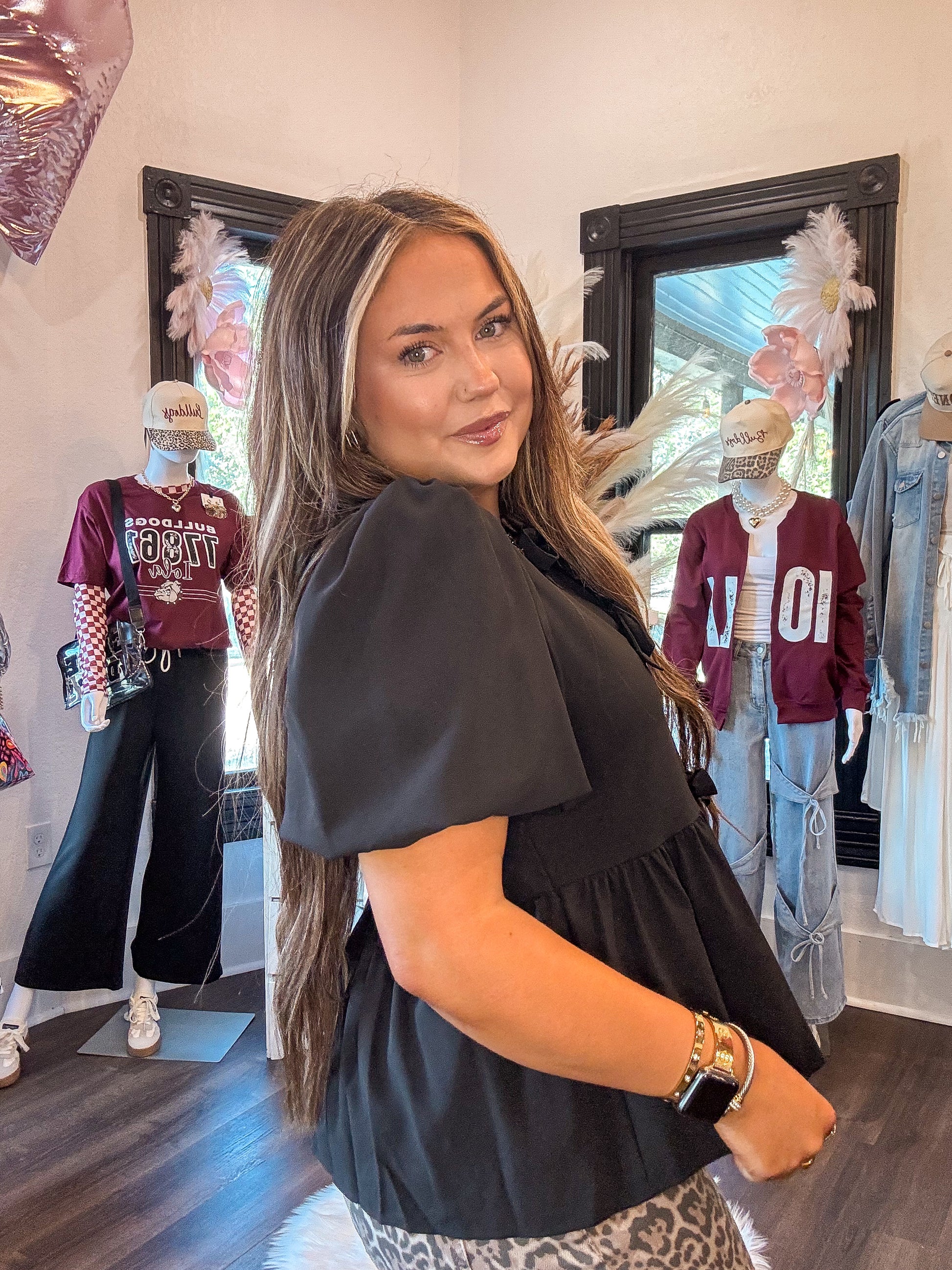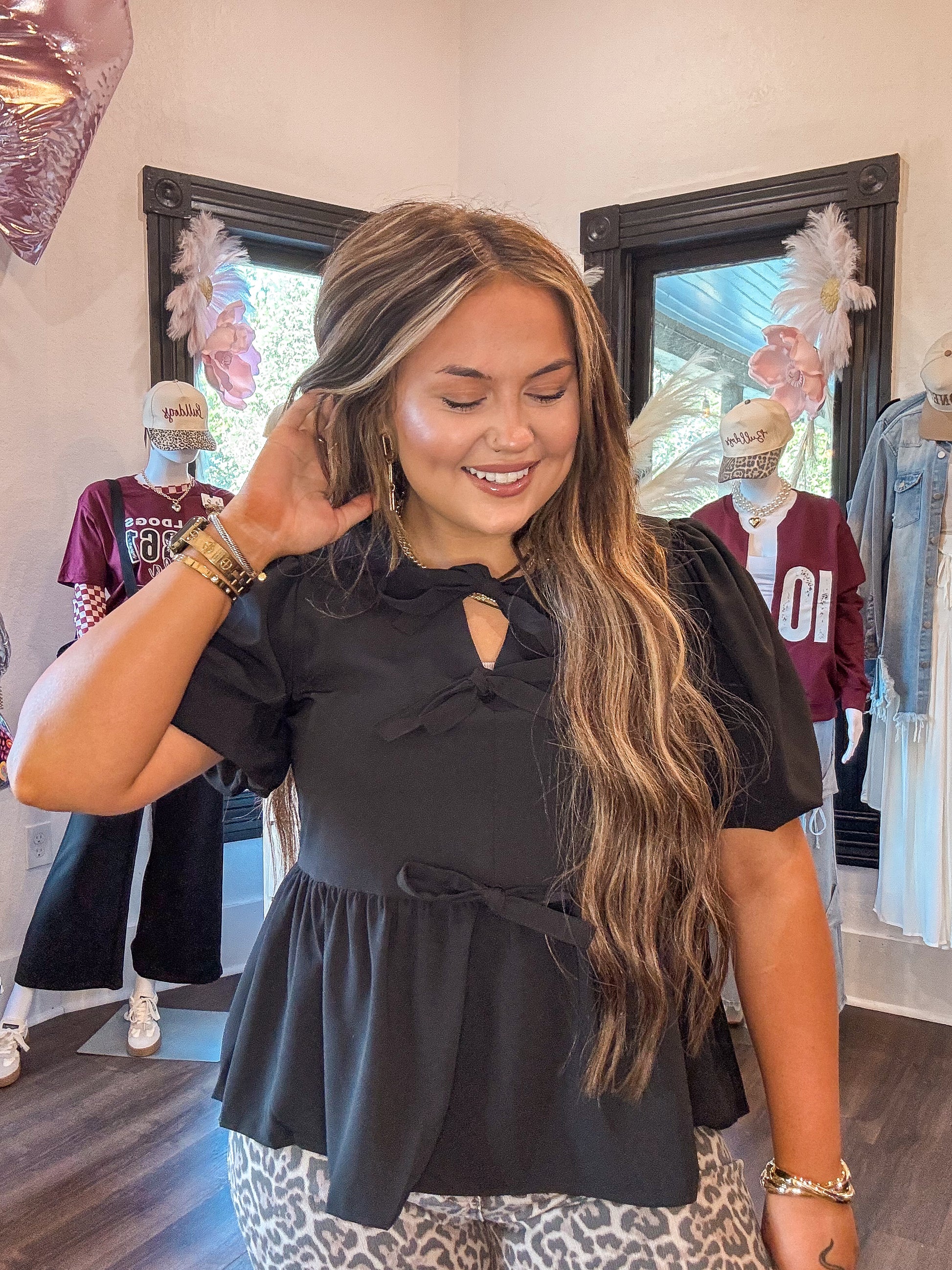 Black Puff Sleeve Bowknot Front Peplum Blouse