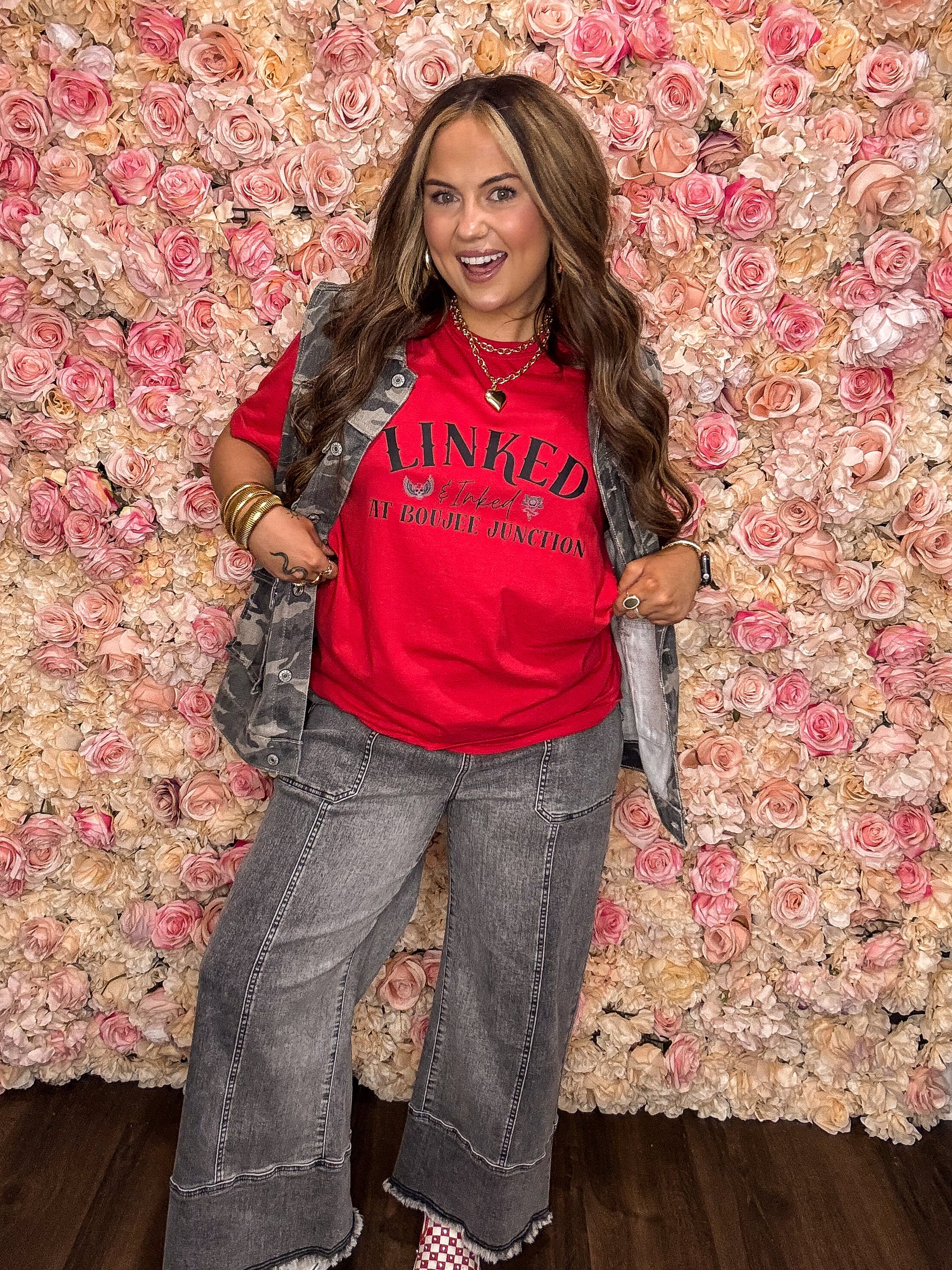 Turn heads in this bold “Linked & Inked at Boujee Junction” graphic tee. Crafted from soft, breathable cotton from Comfort Colors, this vibrant red shirt delivers comfort while serving a standout look. The front features edgy tattoo-inspired graphics paired with a arched collegiate font, making it perfect for anyone who loves expressive, statement style.