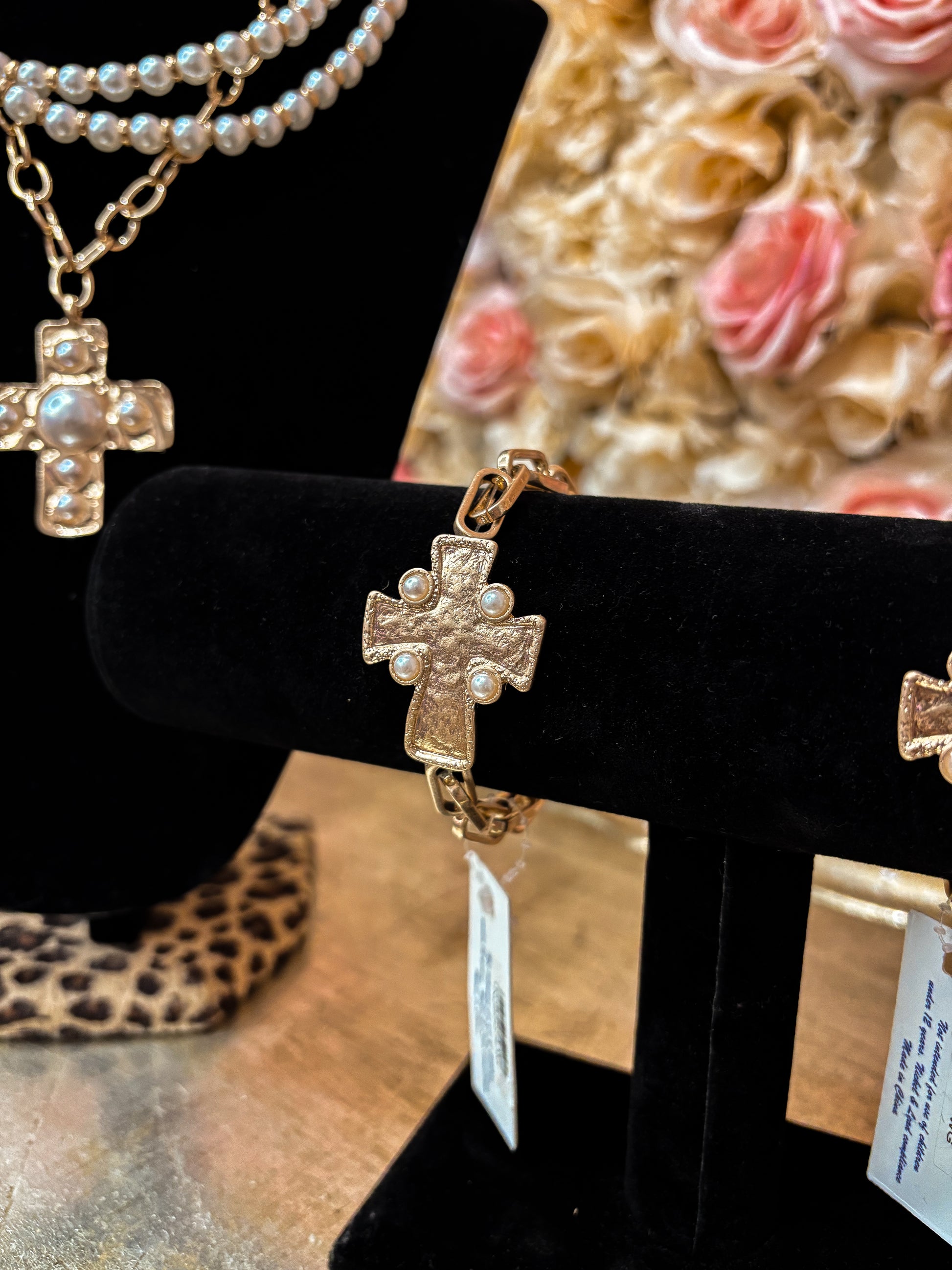 This Pearl-Studded Gold Cross Link Bracelet blends timeless symbolism with elegant design. Featuring textured gold-tone cross links accented with delicate pearl details, each element adds depth and subtle shimmer. The linked construction creates a graceful flow around the wrist, while the antiqued finish lends a vintage-inspired, heirloom feel. Perfect worn alone or layered, this bracelet is a meaningful statement piece that balances faith, femininity, and classic style.
