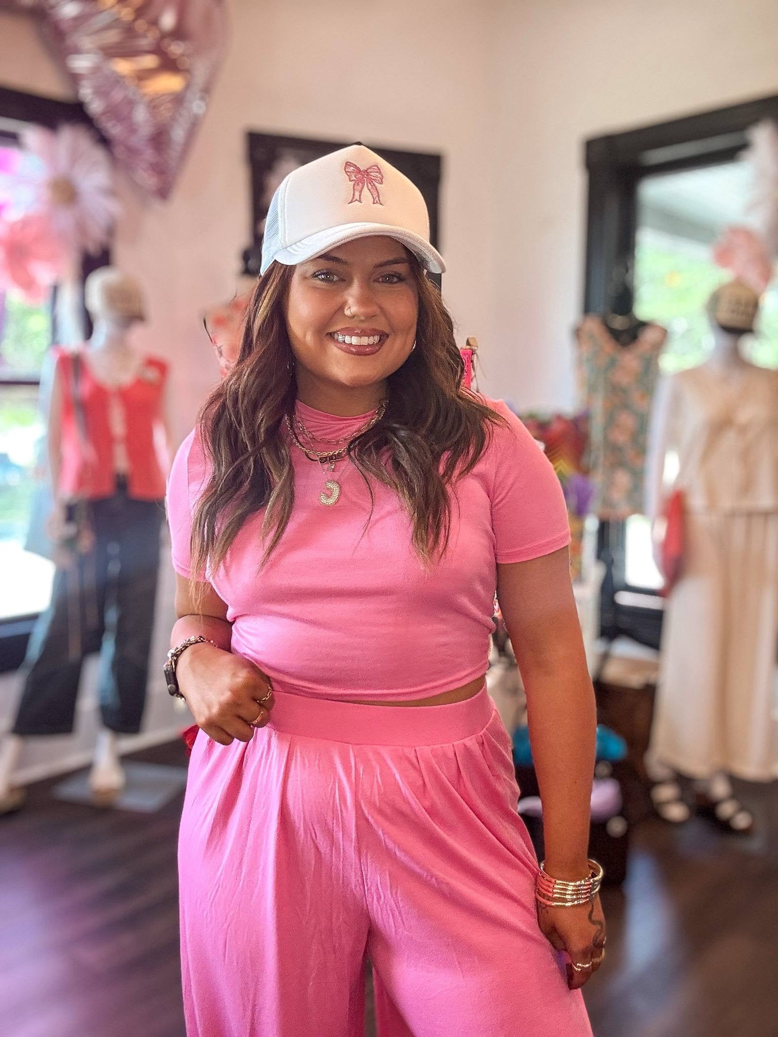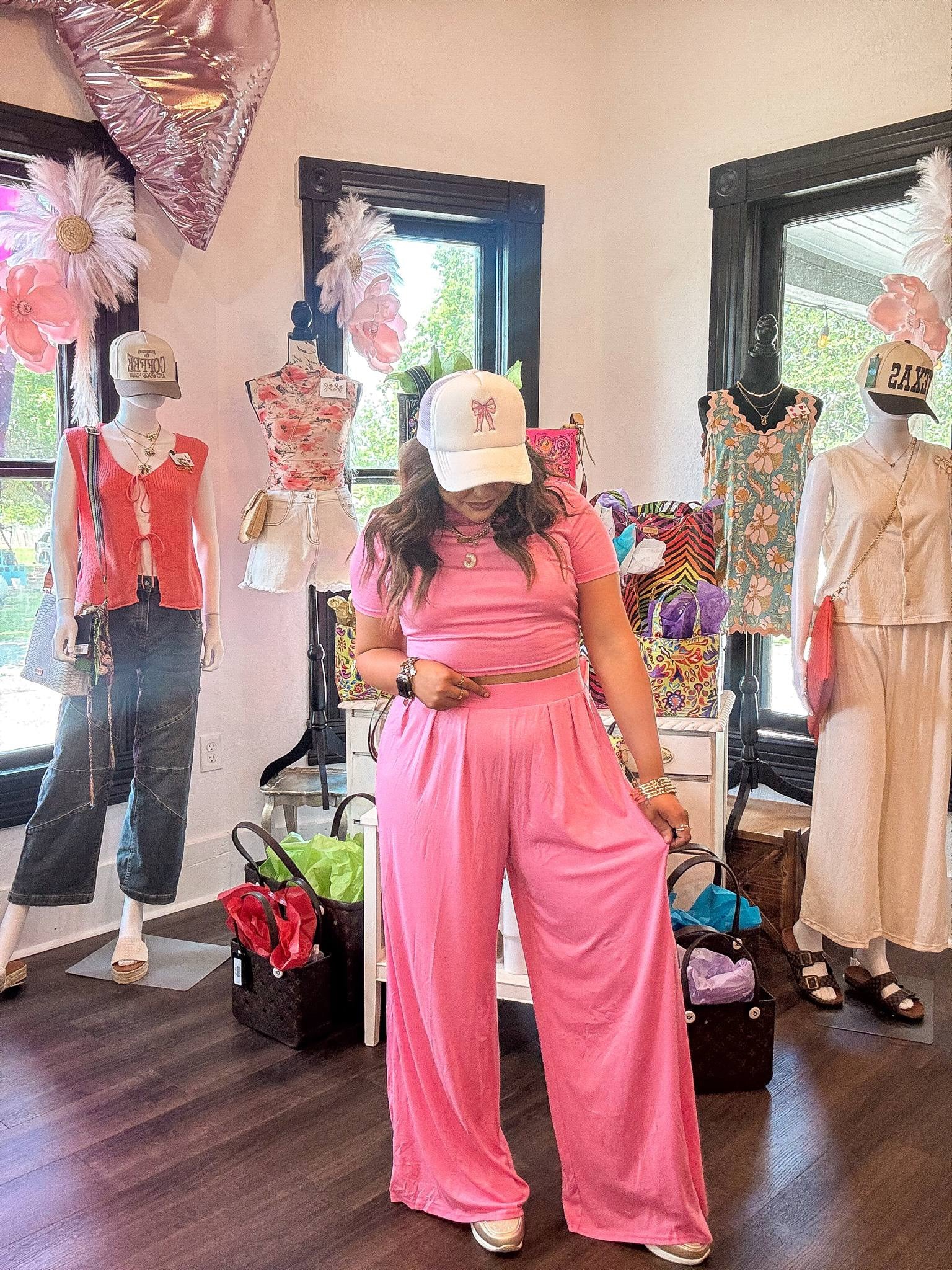 Strawberry Pink Slim Fit Crop Top and Pleated Wide Leg Pants Set