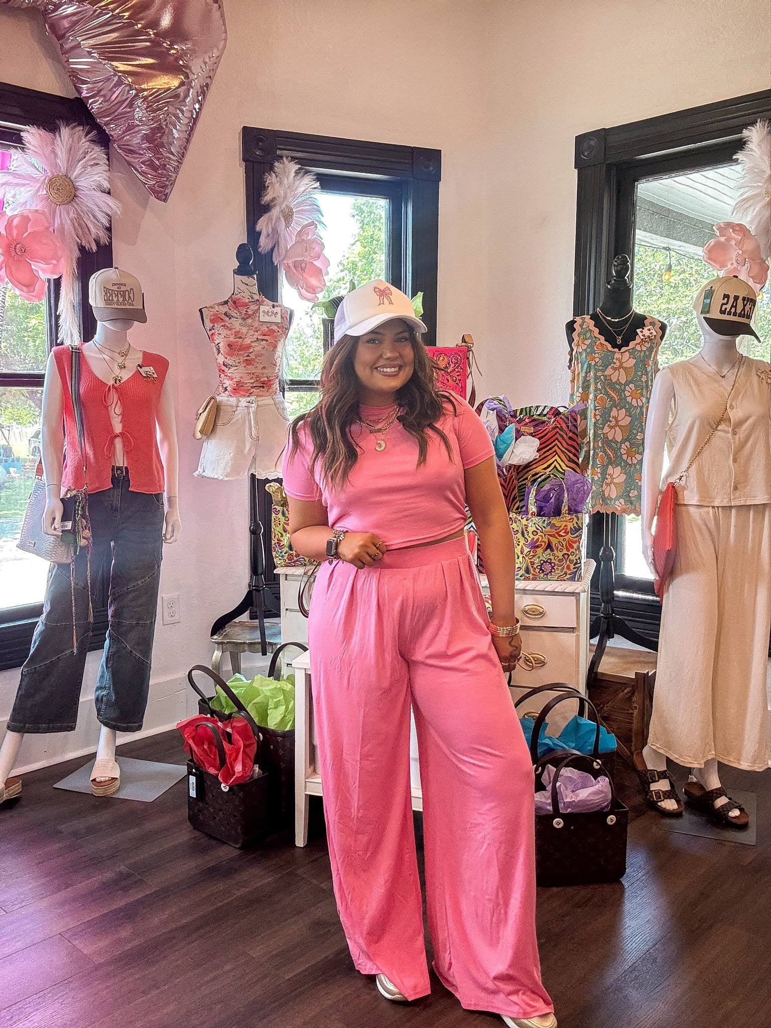Get ready to turn heads in this Strawberry Pink Slim Fit Crop Top and Pleated Wide Leg Pants Set! The vibrant color and slim fit top will accentuate your figure, while the pleated wide leg pants will give you a stylish and comfortable look. Perfect for a day out or a night on the town.
