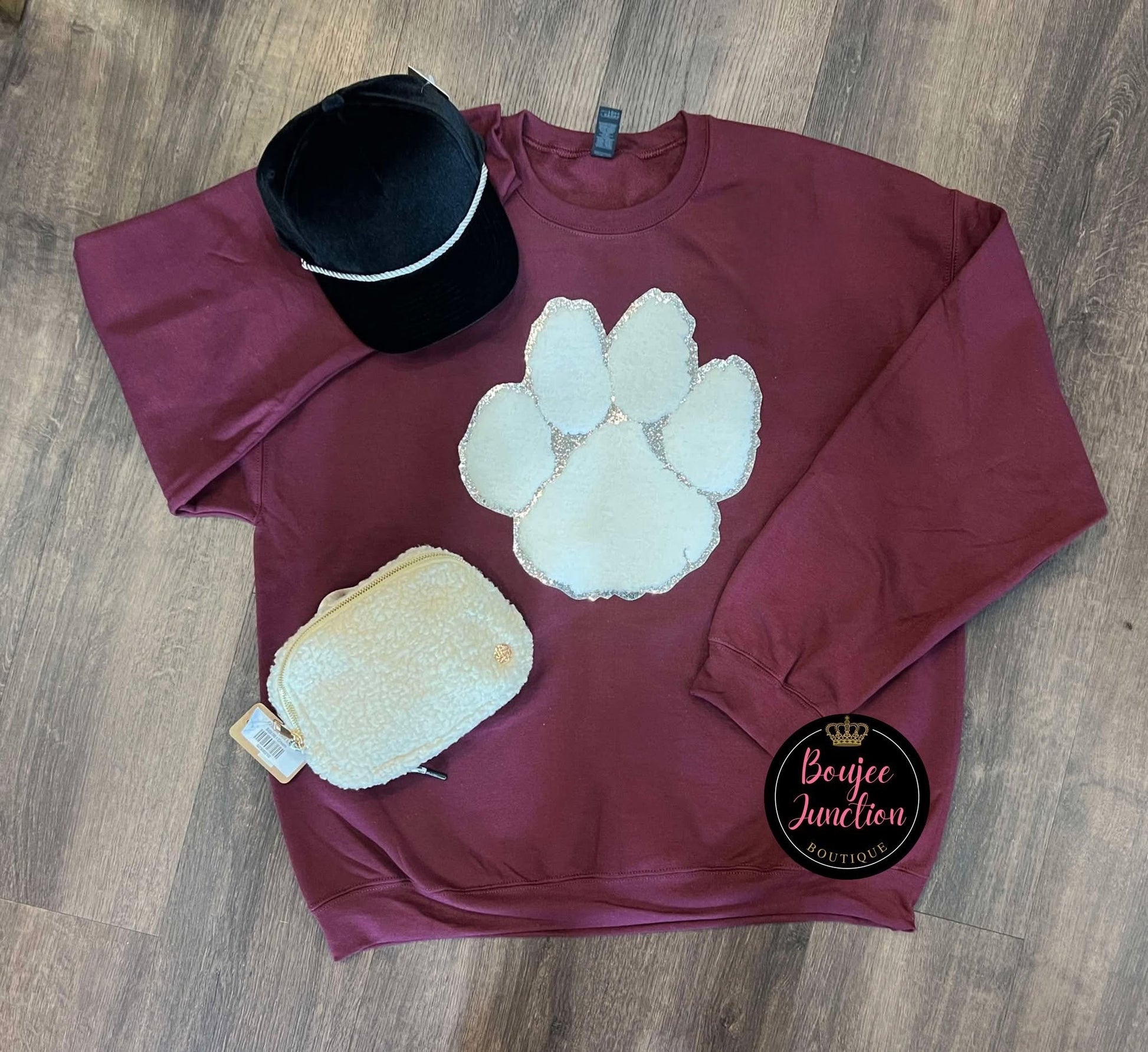 Show your team spirit in cozy style with the White Chenille Paw Print Sweatshirt. Crafted for comfort, its soft chenille paw design adds texture and standout charm perfect for game day excitement. Wear it to cheer loud, stay warm, and celebrate every win in spirited comfort.